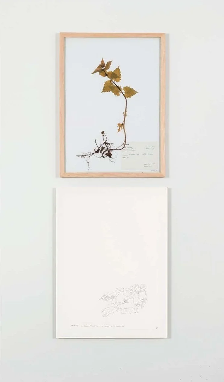 32. Lamiaceae, Lipbloemenfamilie Lamium Album L. Witte Dovenetel, 1999, Diptych: ink on paper under plexiglas; dried fowers and collage on paper, wood frame and glass 19 × 14 inches (48.26 × 35.56 cm) and 20 × 15 inches (50.80 × 38.10 cm), Courtesy of Essex Street/Maxwell Graham, New York.