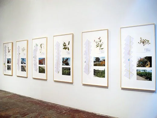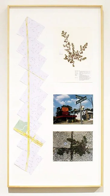 Part testament to the resilience of the natural world in the face of indifference and neglect, and part conceptual investigation into the complex interplay between evidence and site, Geys’ examination of Detroit’s main boulevard was organized and directed from his hometown in Balen, Belgium. Mapping the length of Detroit’s Woodward Avenue, which stretches across the “natural” divides of socio-economic zones from Cadillac Square in the city’s center to neighboring Pontiac, the artist combined the precision of a land surveyor with an organized conceptual model that involved a great deal of chance. Specific intersections were chosen by Geys and visited by Vandebroek, who took photographs and gathered field specimens. The evidence is presented as 12 framed works, which incorporate the actual organic matter of the plants as well as their photographic representation and precise geographic location.