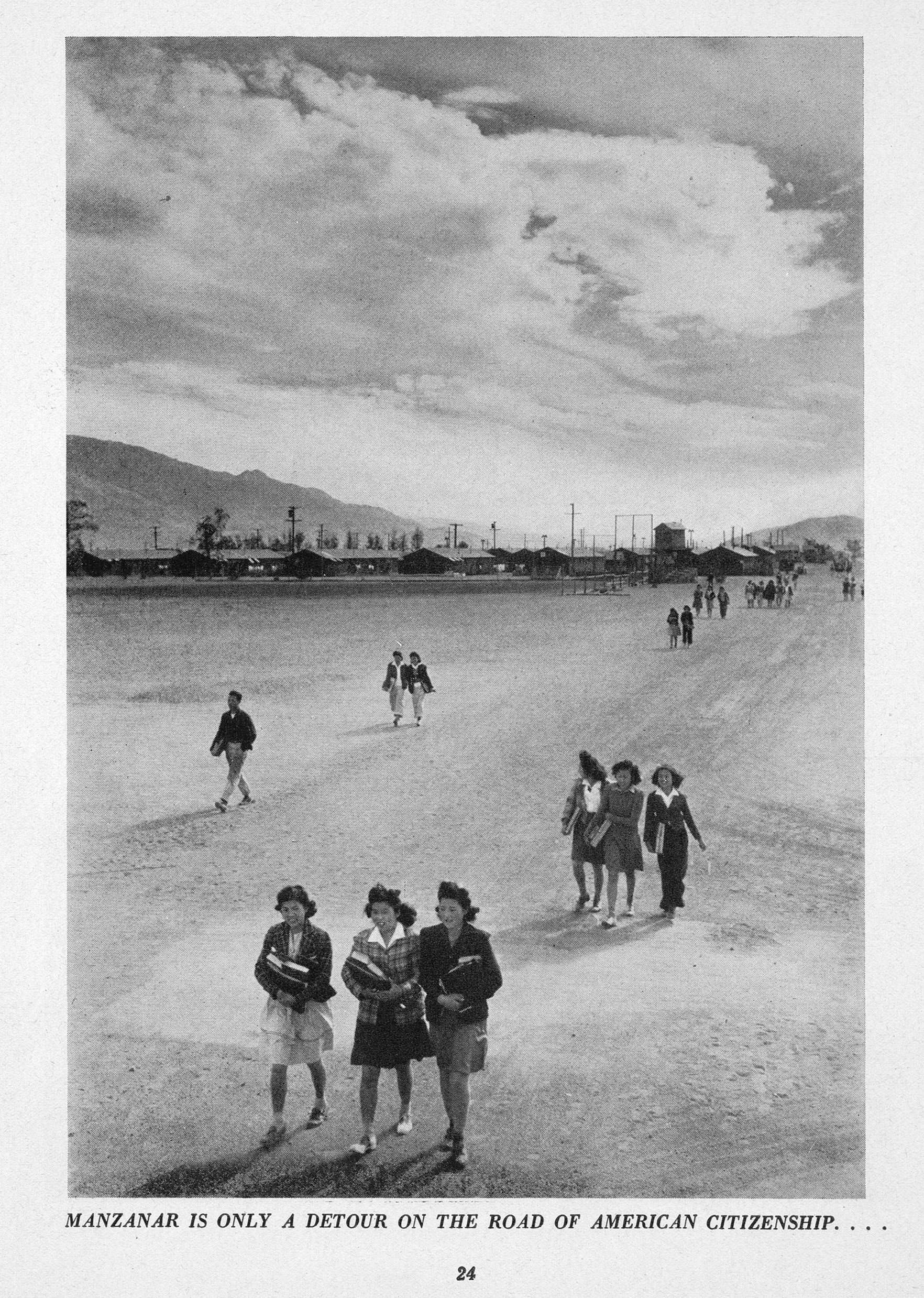 Ansel Adams, “Manzanar is Only a Detour on the Road of American Citizenship...”, Born Free and Equal,1944, p24. U.S. Camera, New York, Courtesy of The Library of Congress.