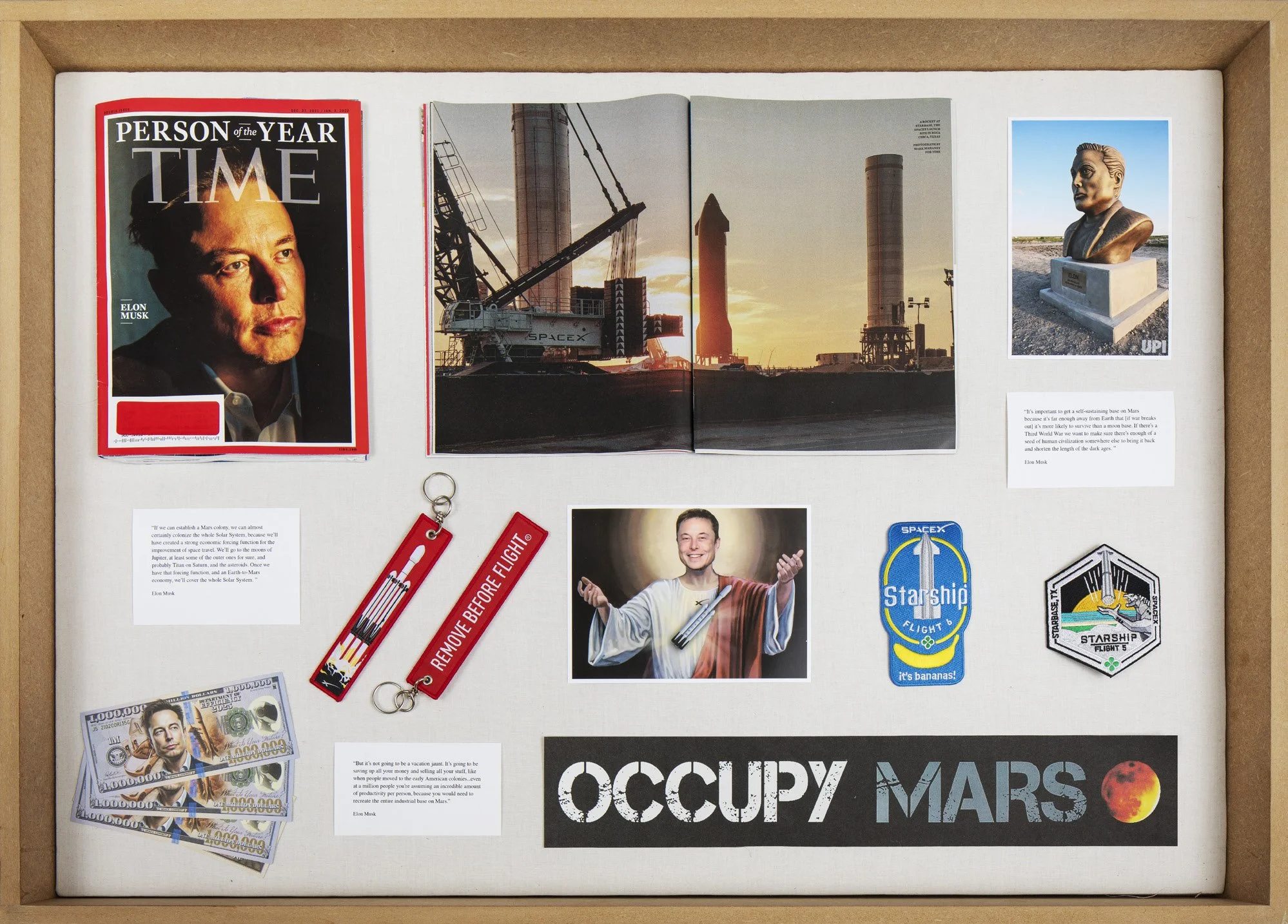 Installation Detail, Archival Material (Elon Musk), Rich Land, Poor Land, Carriage Trade, Photo: Nicholas Knight.